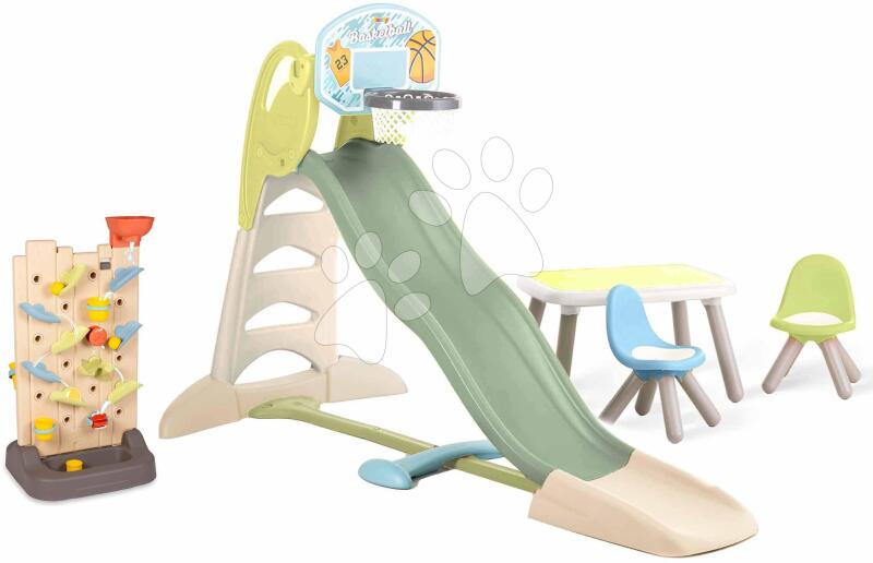 Csúszda vízsugárral Toboggan XL Slide Life a francia Smoby műhelyéből fiúknak és lányoknak egyaránt élményekkel teli szórakozást nyújt már 3 éves kortól.  A csúszda rendkívül erős felépítéssel bír, 50 kg-os teherbírással büszkélkedik, a csúszófelülete hossza 2,3 méter. Erős és strapabíró műanyagból készült, mely bársonyos tapintású, emellett lágy lekerekített élekkel rendelkezik. A gyermekcsúszda biztonságát masszív fogantyúk és Blow Molding technológiával készült csúszásgátló lépcsők garantálják, amelyek rendkívül erősek és stabilak. A csúszda locsolócsőre köthető, aminek köszönhetően a gyerekek tobogánként is használhatják, ami hűvös felüdülést hoz nekik a forró nyári napokon. A kosárlabda palánk segítségével a fiúk és a lányok kosarazhatnak a friss levegőn, a csúszda különböző oldalaira is rögzíthető, pont mint klasszikus módon a falra is.  Gyerekek nagy örömmel fogadják a vizes játékot is, mely a csúszda alá, vagy a kertben bárhol elhelyezve jó mókázást ígér. Vizes játék kerti locsolócsőre köthető, így vizes alagút hangulatát kelti.  A szórófejek magassága állítható, ez lehetővé teszi a vízsugár erősségének beállítását a víznyomástól függően. Activity Wall játszófal 29 kiegészítővel együtt készen áll a kicsiket szórakoztatni, fejleszteni kreativitásukat és fantáziájukat 6 mókás tevékenységgel együtt. Labdavezető pálya, vízi pálya, kerék sporttevékenységekkel, ötödölő, labdadobáló, vagy a krétával rajzolás mind a kicsik fejlődését szolgálja.  Kertben kellemes pihenés vár a gyerkőcökre köszönhetően a kerti bútoroknak, melyek közt asztal és 2 KidChair szék is megtalálható. Kerti székek kényelmes háttámasszal rendelkeznek, teherbírásuk 50 kg. Kerti bútor tartós, stabil, és beltéren is kihasználható. Az ülőrész 27 cm, miközben teljes magassága 50 cm. A csúszda felülete UV szűrővel van ellátva, amely megvédi a színeket a fakulástól, aminek köszönhetően a csúszda hosszas használat után is újszerűnek tűnik majd. A csúszda ökológiai módon készült, a gyártás során 80%-ban újrahasznosított anyagot használtak fel, ami jelentősen hozzájárult a környezet védelméhez. Smoby  kiváló minőségű és modern műanyag gyerekjátékokat gyártó neves  francia cég már évtizedek óta.  Smoby játékok műanyaga szilárd és strapabíró, de egyben finom és sima a gyerek kezecskéknek, érintésre bársonyos . Minden Smoby gyerekjáték  éle lekerekített , hogy a gyerekeket vidám játék közben ne fenyegesse sérülés veszélye. Smoby termékek színei nagyon jó hatással vannak a gyermeki elképzelőerő és fantázia fejlődésére. Jellemzői